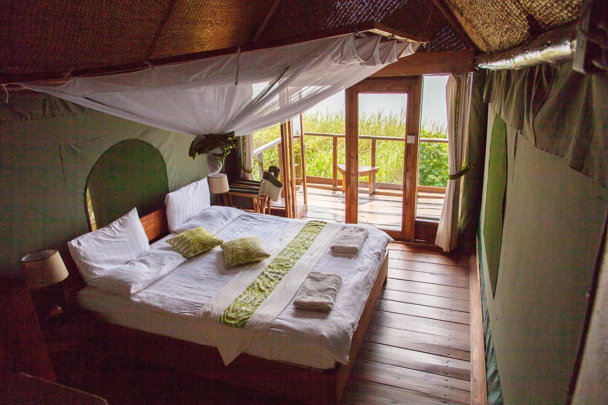 Guests can stay in one of 13 en-suite Cottages that come in single, double/twin, and triple room configurations. Each cottage is perched on a wooden platform and has a private verandah with uninterrupted views of Lake Mutanda. Enjoy delicious meals from the resort’s restaurant and sundowners on the main verandah while otters visit the shore.